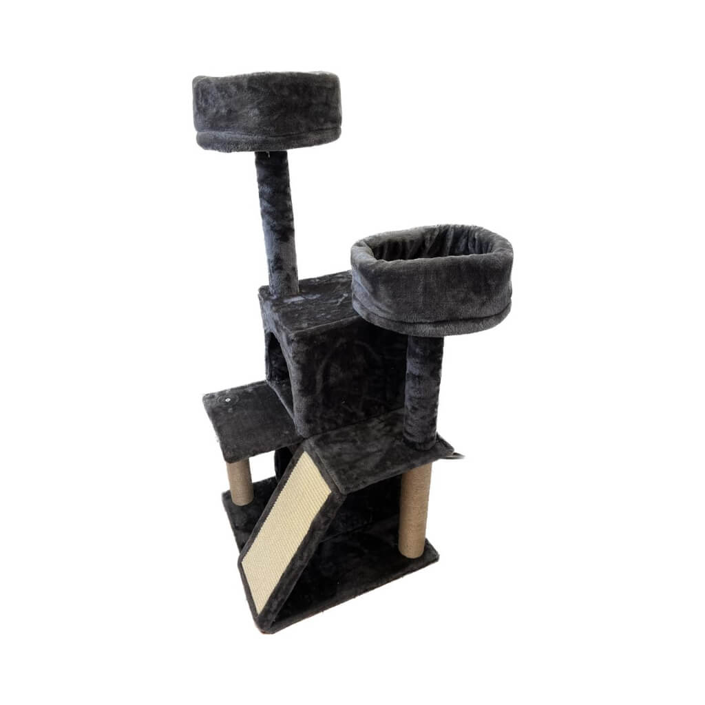 • Equipado con 2 casetas, 3 plataformas, 2 plataformas de descanso acolchadas y 2 rascadores. Tu gato/a podrá realizar una amplia variedad de entrenamientos, descansar y limarse sus uñas mientras tú no estés.