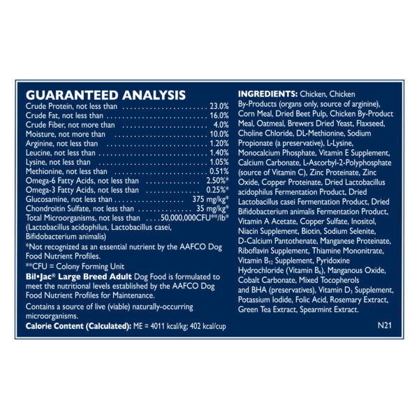Bil Jac Large Breed Adult es un alimento seco especialmente formulado para perros adultos de razas grandes. Contiene pollo real como ingrediente principal y niveles garantizados de glucosamina y sulfato de condroitina para el cuidado de huesos y articulaciones.