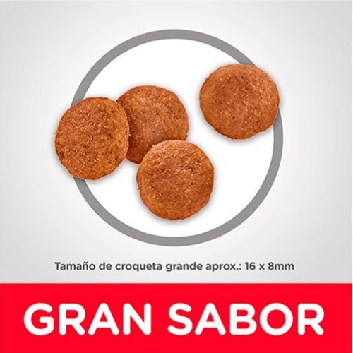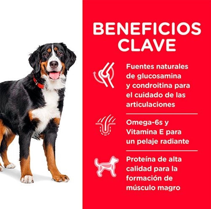 Hill's Large Breed Adult es un alimento balanceado para perros adultos de razas grandes. Contiene glucosamina y condroitina para el soporte articular y proteínas de calidad para músculos fuertes. Promueve una vida activa y saludable.