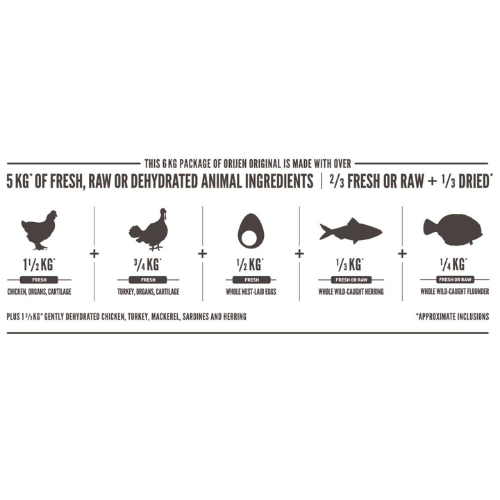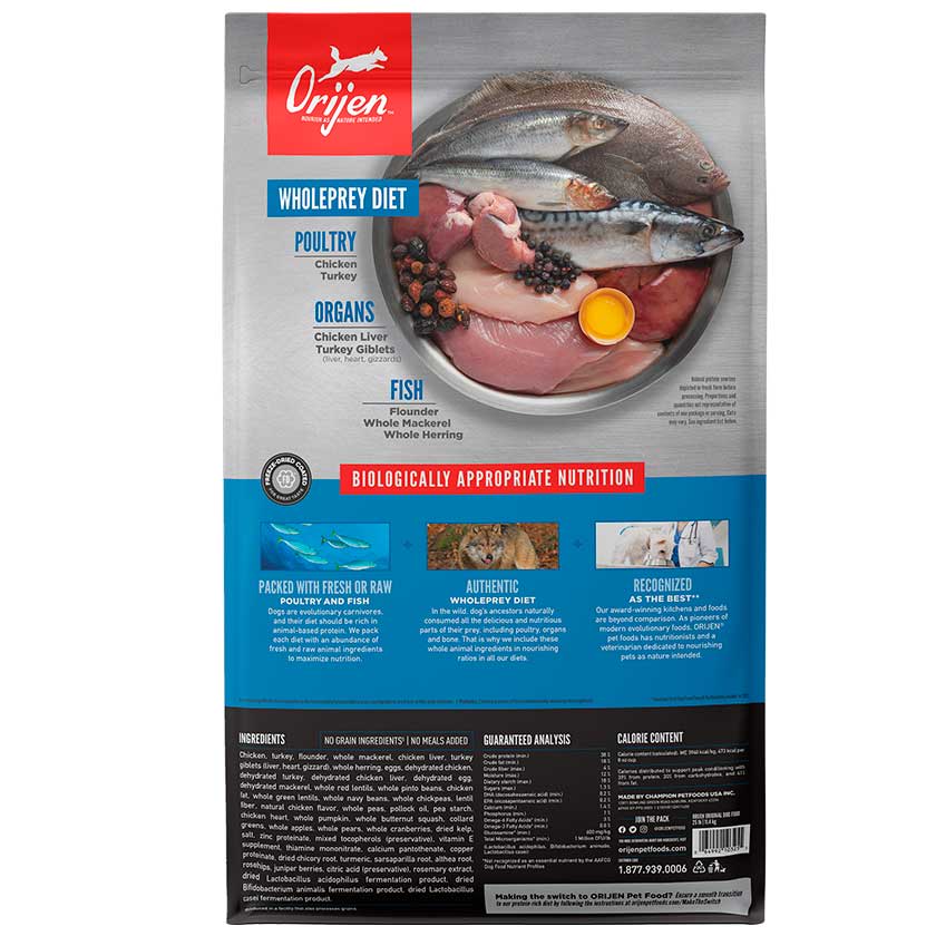 Orijen Original Dog es un alimento para perros con un 85% de ingredientes de origen animal, como pollo, pavo y pescado de captura silvestre. Está formulado con una alta cantidad de proteínas y baja en carbohidratos. Ideal para una nutrición biológicamente apropiada.